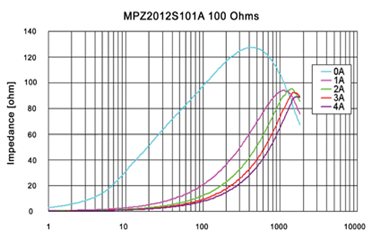 电感的饱和电流大家一定会关注,而磁珠的额定电流通常会大于饱和电流,造成即使在额定电流范围内使用,磁珠也会出现饱和的情况,阻抗频率曲线也会发生偏移。