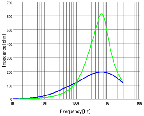 采用立式电极结构,分布电容相对较小,磁珠的自谐振点也相对偏高,高频滤波效果相对较好,下图是采用立式电极结构磁珠的阻抗频率曲线。